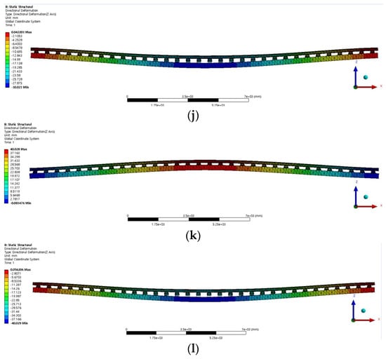 FE analysis results (displacement, z direction) for: (a) 5 mm uplift; (b) 5 mm subsidence; (c) 10 mm uplift; (d) 10 mm subsidence; (e) 20 mm uplift; (f) 20 mm subsidence; (g) 25 mm uplift; (h) 25 mm subsidence; (i) 30 mm uplift; (j) 30 mm subsidence; (k) 40 mm uplift; and (l) 40 mm subsidence.