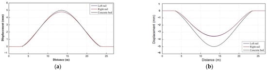 In this study, the relative displacement between the rail and concrete bed was analyzed according to the magnitude and direction of substructure deformation. Figure 7a,b shows the displacements of the two rails and the concrete bed under the 5 mm uplift and subsidence conditions, and Figure 7c,d shows the rail displacements under uplift and subsidence conditions, respectively, of 10, 20, 30, and 40 mm.