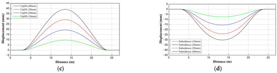 Figure 6a–l shows the general performance of this model, demonstrating the FE analysis results of uplift and subsidence of 5 mm, 10 mm, 20 mm, 25 mm, 30 mm, and 40 mm, respectively.