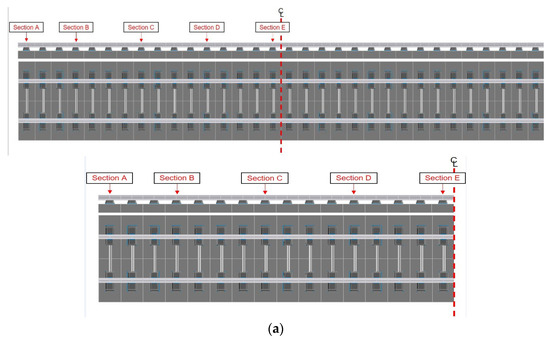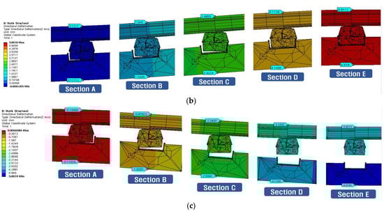 The contact conditions and relative displacements between the RC sleepers and concrete bed were analyzed by location according to the type of applied substructure deformation (i.e., uplift or subsidence). The analysis locations were selected with equal spacing from the end to the center of the model segment, labelled Section A to Section E in Figure 8a. Figure 8b,c shows the contact conditions obtained by the analysis at each location when the model was subjected to uplift or subsidence, respectively.