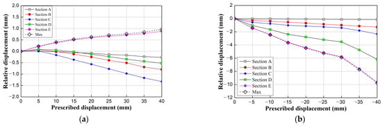 Additionally, the relative displacements between the concrete bed and RC sleepers were calculated at Sections A through E by subtracting the RC sleeper displacement from that of the concrete bed. In this analysis, a negative (−) relative displacement indicates the occurrence of a floating sleeper, and a positive (+) relative displacement indicates compressive deformation of the resilience pad. The relative displacement results are shown in Figure 9. As shown in Figure 9a, the maximum relative displacements under substructure uplift at Sections A, B, C, D, and E were 0.267, 0.796, 1.325, 0.524, and 0.875 mm, respectively. Additionally, note that the floating sleeper phenomenon occurred at all locations from Sections A to D for the evaluated uplift conditions between 10 and 40 mm. On the other hand, at Section E (i.e., at the center of the concrete bed), the resilience pad clearly experienced elastic deformation due to compression, reducing the uplift displacement. As shown in Figure 9b, the maximum relative displacements under substructure subsidence at Sections A, B, C, D, and E were 0.146, 1.283, 2.333, 6.181, and 9.648 mm, respectively, with the floating sleeper phenomenon occurring at all locations. Therefore, the results of the relative displacement analysis indicated that the difference in the flexural curvature of the concrete bed and rail affected the track deformation according to the displacement direction.
