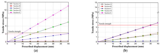 As can be observed in the tensile stresses reported in Figure 11a, the maximum tensile stress at Section E (i.e., the center of the concrete bed model) exceeded the flexural strength of the concrete bed under uplifts of 10 mm or greater. At Section D, the maximum tensile stress exceeded the flexural strength of the concrete bed under uplifts of 20 mm or greater. On the other hand, at Sections A–C, the maximum tensile stress never exceeded the flexural strength of the concrete bed, even under an uplift of 40 mm; however, at Section C, the maximum tensile stress may exceed the flexural strength under an uplift greater than 40 mm.