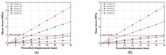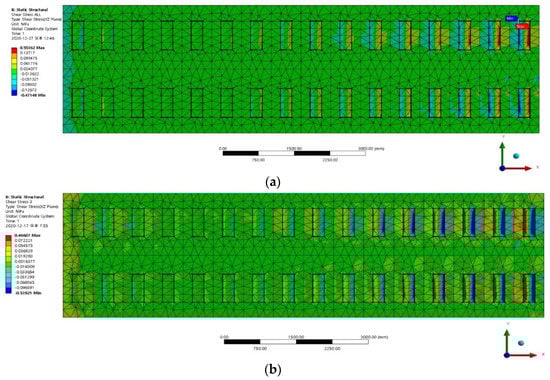 FE analysis results (shear stress, xz direction) for (a) 5 mm uplift and (b) 5 mm subsidence.