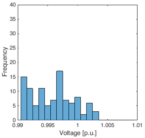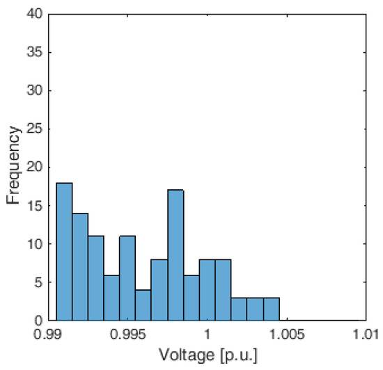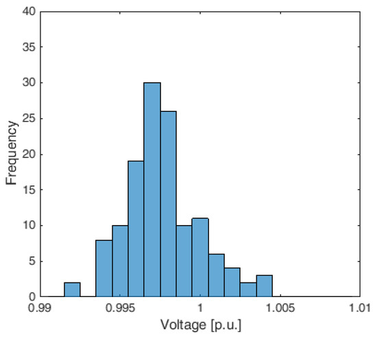 For sake of completeness, Table 10 shows the statistical parameters of the nodal voltages distribution obtained by the Decentralized APP for both the partitions and in the three operating conditions. In addition, in this case, the values assumed by the standard deviations are almost equal to the ones obtained by the centralized approach and always very small. With reference only to Case 3, the histograms of the nodal voltage distribution calculated by the Decentralized APP for both the partitions are reported in Figure 9 and Figure 10, respectively.
