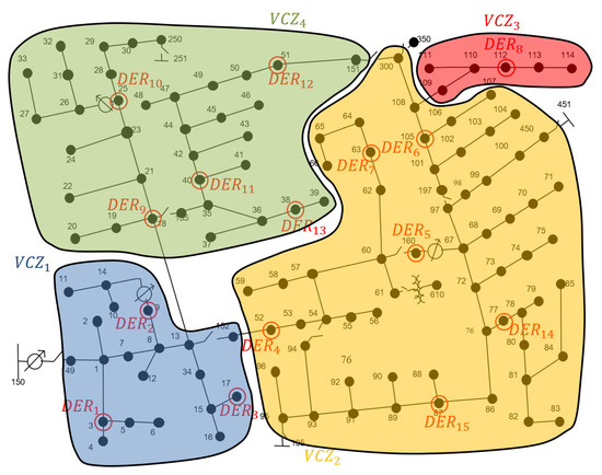 By adopting the network partitioning method in [22], the distribution grid is divided into VCZs; then, for each VCZ, a PN is identified [30]. The VOP (1) can be split into a set of reduced-size subproblems written for each VCZ according to