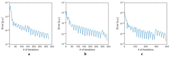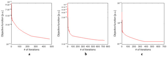 Figure 11 and Figure 12 show the evolutions of, respectively, the objective function and the coupling error, for the partitioning in four VCZs in the three cases. It is evident that in all the cases the number of iterations does not exceed the value of 400. The worst performance is in Case 3, where the number of iterations to convergence is almost equal to 400.
