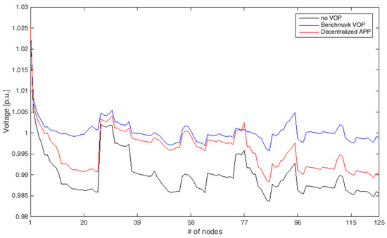In this subsection, the performance of the decentralized VOP based on the APP algorithm, referred to in the following as Decentralized APP, is tested by solving the problem (14)–(16) for the partitioning in both four and seven VCZs. Table 8 shows the final values of the objective function obtained by the APP algorithm for the two considered partitioning and in the three considered cases. For the sake of comparison, Table 8 reports also the results obtained by the centralized solution of the original problem (3), referred to as Centralized VCZ-based VOP. From the results, it is apparent that the values of the objective function obtained by decentralized and centralized algorithms are comparable for both the network partitions and in all the cases. As expected, these results give evidence that the Decentralized APP converges to solutions that are equal or slightly worse to the ones given by Centralized VCZ-based VOP in terms of objective function. However, the optimal solutions may correspond to different set-points of active and reactive powers of DER controllers. Consequently, the resulting voltage profiles could be different, as evidenced by the values assumed by the VPI.