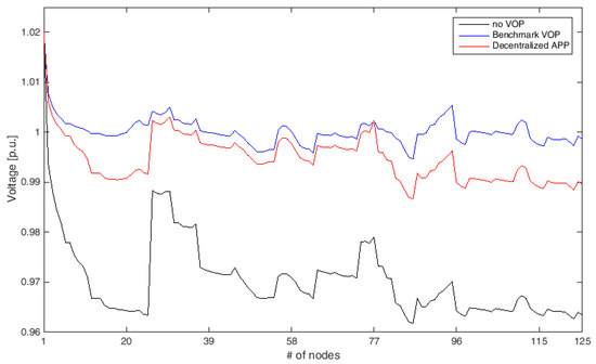 The network voltage profile for the no VOP, Benchmark VOP, and Decentralized APP in Case 2.