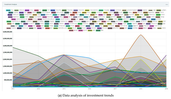 We also collected data on foreign investment in Korea by country by year, data on new business registration by locality, and invested industries from the website “data.co.kr” (accessed on 24 July 2020). These data were analyzed to find out investment trends in Korea and used for advice and suggestions to users of the system.