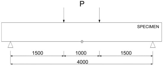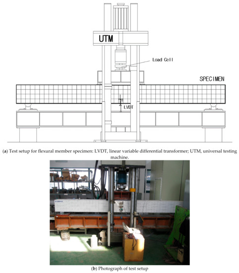 Each specimen was installed in a universal testing machine with a maximum capacity of 3000 kN; the load had two simple support points (Figure 2 and Figure 3). To measure the displacement of the specimen, a linear variable differential transformer (LVDT) was installed on each side of the loading point at the centre, and the displacement of the specimen centre was measured. The strain of the tensile steel bars was measured by attaching the LVDTs to the steel bars at both ends when the type of steel bar specimen was the same or different.