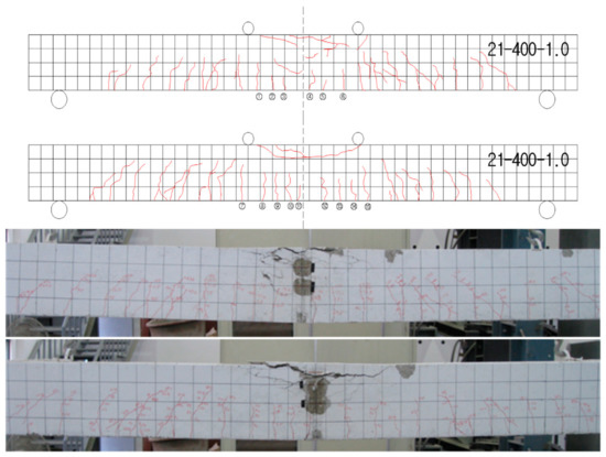 The experiment was conducted considering the typical yield of steel bars for every specimen. The initial cracks were generated at the centre of the specimen. The number and width of the cracks at the centre increased with the load. Diagonal cracks were generated at both ends after reaching the yield load. Upon surpassing the yield load, the displacement increased sharply as the load gradually increased, and the experiment was terminated. The failure mode of the specimen was a flexural failure, and the cracking pattern also indicated the flexural failure, as a vertical crack occurred first in the pure bending section at the centre of the specimen, following which the crack progressed from the centre to the support point. All specimens showed similar overall cracking modes in general.