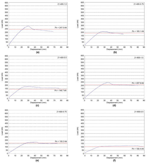 Load–displacement curves of specimens: (a) 21-400-1.0 specimen; (b) 21-400-0.75 specimen; (c) 21-400-0.5 specimen; (d) 21-600-1.0 specimen; (e) 21-600-0.75 specimen; (f) 21-600-0.5 specimen.