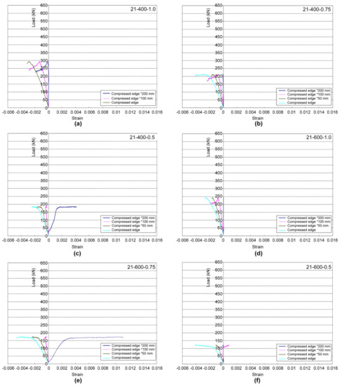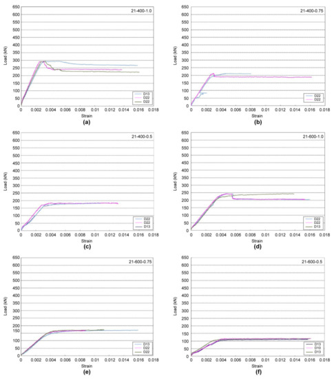 Load–strain curves of specimens (concrete): (a) 21-400-1.0 specimen; (b) 21-400-0.75 specimen; (c) 21-400-0.5 specimen; (d) 21-600-1.0 specimen; (e) 21-600-0.75 specimen; (f) 21-600-0.5 specimen.