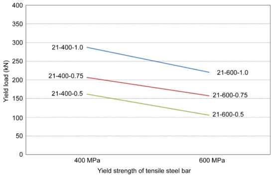 To examine the effects of the yield strength of tensile steel bars, they were divided into two types (400 MPa, 600 MPa), and the experiment results are shown in Figure 8.