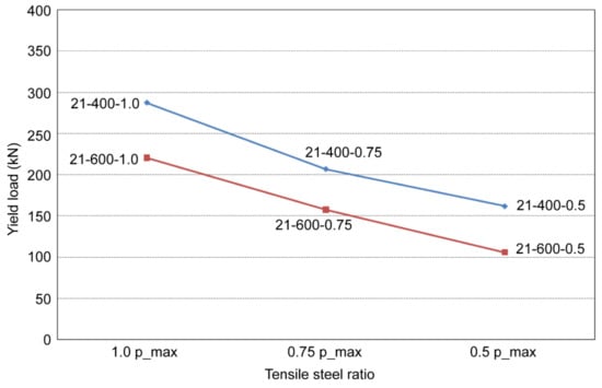 When the tensile steel ratio was 1.0, the tensile steel bar specimen with a yield strength of 600 MPa showed a nominal load, yield load, and maximum load 1.19, 1.3, and 1.21 times higher than those of the specimen with a yield strength of 400 MPa. When the tensile steel ratio was 0.75, the tensile steel bar specimen with a yield strength of 600 MPa showed a nominal load, yield load, and maximum load 1.18, 1.31, and 1.22 times higher than those of the specimen with a yield strength of 400 MPa. Furthermore, when the tensile steel ratio was 0.5, the tensile steel bar specimen with a yield strength of 600 MPa showed a nominal load, yield load, and maximum load 1.46, 1.53, and 1.52 times higher than those of the specimen with a yield strength of 400 MPa.