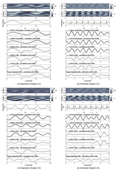 Figure 5 shows extracted VS signals depending on range-bin selection methods. As shown in Figure 5, the proposed method selected the pair of range-bins for which showed the coherency and correlations between and referenced VSs were high. However, in the same range-bins, m in Figure 5a and m in Figure 5d do not represent respiration or heartbeat, although m in Figure 5b and m in Figure 5c are proportional to referenced heartbeat or respiration. Although represented vital displacement as in Figure 5b,c, was not reliable in measuring VS displacement as in Figure 5a,d. Consequently, the accuracy of VSs extracted by method in [37] varied among the subjects. Furthermore, both and of methods in [38,39,40] had inaccurate information about both respiration and heartbeat considering the correlation with the reference.