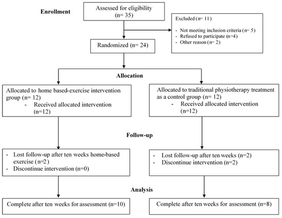 After a baseline evaluation, individuals with PD and their relatives in the HOME group were given a series of home-based exercises in a booklet and watched the video instructions recommended by Schenkman et al. (1998) on how to do the exercises [3,16]. In addition, they also received a booklet with step-by-step instructions and illustrations of the exercise programme (Supplementary File S1). The exercise training sessions consisted of a 45 min segmental rotation exercise in supine, side lying, sitting and standing positions to increase flexibility and mobility, a 5 min throwing task to improve balance and challenge stability, and a 10 min gait training exercise. These elements of the exercise programme were approved by PD experts (FK, SK, PS and AA). Each session took about 60 min and was completed every day for 10 weeks. The control group (CON) had traditional physiotherapy (PT) treatment for a one-hour session twice a week for 10 weeks, facilitated by an experienced neurological physiotherapist, which included stretching exercises, strengthening exercises, and gait and balance training. Participants in both groups had to strictly adhere to their usual medications. Every week the researcher phoned the participants or their relatives within the home group to address any concerns. The experimental protocol and testing procedure were explained prior to the patients completing an informed consent form, in keeping with the Declaration of Helsinki. The local Ethics Committee on Human Experimentation approved the study (MU-CIRB 2020/048.1902), and the clinical trial was registered on clinicaltrials.gov (NCT04810897).