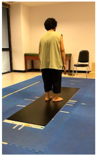 Gait characteristics were assessed using a 3 m force distribution platform (The Zebris FDM-System-Gait Analysis; Zebris Medical GmbH, Isny, Germany) with a sampling frequency of 100 Hz, which was synchronized with a video camera (SC-1 SYNCCam; Zebris Medical GmbH) (Figure 2). The participants stood at the edge of the platform and were asked to walk barefoot at a comfortable speed to the other end of the platform, this was repeated for a total of 3 trials. The averaged data were recorded for foot rotation (deg), step width (cm), step length (cm), step time (s), cadence (steps/min) and gait velocity (km/s).