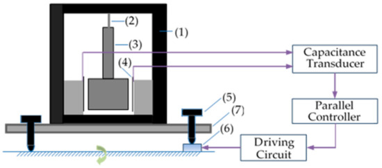 The schematic diagram of the tilt AVI. (1) is the supporting frame, (2) is the flat elastic spring, (3) is the pendulum body, (4) is the capacitance plates, (5) is the adjustable supporting plot, (6) is the piezoelectric actuator, (7) is the plate of the tiltmeter’s base.