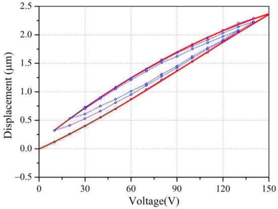 To improve the driving control accuracy of the piezoelectric actuator with a type of NAC2023 whose resonant frequency is 486 kHz, a polynomial model is applied to hysteresis modeling and compensation because of its speed and practicality, and this enables a precise description of the hysteresis phenomenon based on the statistic rule [15,16]. Calibrating the relationship between the displacement and the direct current (DC) driving voltage within the piezoelectric actuator is performed via the optical platform in a stable experimental environment. The driving voltages of the actuator are provided by a piezoelectric power controller, and the displacements are measured by a linear variable differential transformer (LVDT) of the XSI3000 type, whose resolution is about 0.005. The test and measurement results for hysteresis, which are marked with the symbol “o”, and which include rising and descending hysteresis curves denoted by blue and dotted lines, are shown in Figure 3. In Figure 3, it is obvious that each ascending curve has an inflection point, but the descending curves do not have one. Therefore, we use the third and second polynomials, respectively, to fit the ascending and descending hysteresis curves. For example, the fitting results, denoted by the red and solid lines of the outermost ring, are respectively expressed by