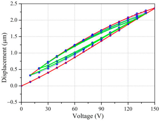where and are the displacement of the actuator in the ascending and descending stages, respectively, and is the driving voltage of the actuator.
