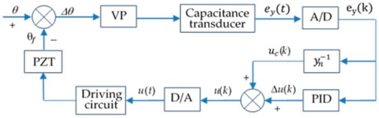The VP will depart from its former central position due to tilt vibration acting on the supporting frame. Then, a gap variation between the VP and two capacitances will be produced and measured by a bridge-type capacitance transducer, which is a kind of capacitance sensor, the electric diagram of which is given in Reference 14. To ensure the precise operation of the piezoelectric servo-controlled actuator in a large displacement range, a digital and parallel controller, consisting of a hysteresis inverse model predictor and a PID adjuster, is adopted. This guides the driving circuit to generate the proper voltage to be applied to the two piezoelectric transducers. The digital and parallel controller is implemented by the field programmable gate array (FPGA) in order to easily adjust the controller’s parameters. Finally, the VP is driven back to its former central position by the servo-controlled actuator, and the supporting frame also returns to the horizontal state. This means that the supporting frame is immune to the tilt vibration of the ground base. For example, the ground tilting to the right causes the frame to tilt to the right, as shown in Figure 1, and the feedback control circuit drives the PZT to tilt the frame to the left so as to balance the tilt, such that the frame returns to the horizontal state.