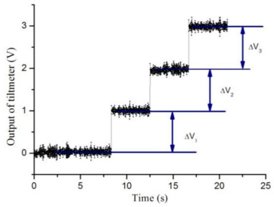 To investigate the response of the VP to tilt, the VP tiltmeter works in an open-loop mode without feedback from the piezoelectric actuator. The sensitivity of the VP tiltmeter is calibrated experimentally with a cylindrical piezoelectric transducer of the 20VS12 type, and with a displacement resolution of about . The PZT is placed under the base plate, and the screw supporter is adjusted to make the VP close to horizontal. A voltage controller of the XE501D type drives the PZTs to produce three displacement steps of . Figure 6 shows the output curve of the device with a baseline of during the calibration, and the parameters , , and are the three increments of output voltage, respectively. We chose the average of three calibrations as the tilt sensitivity of the VP tiltmeter, so the sensitivity was about .