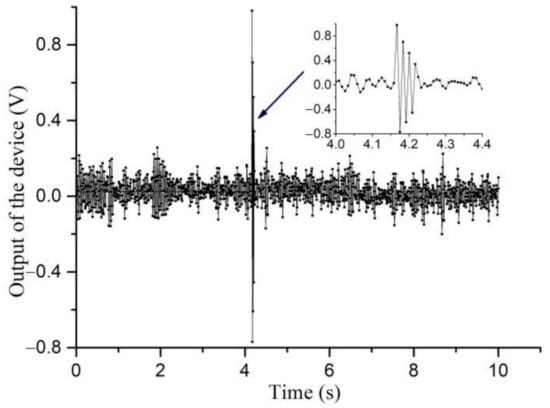 Firstly, the VP tiltmeter is in the horizontal state, and the cylindrical piezoelectric transducer is extended by 1um through the output voltage of the voltage controller to generate a tilt signal to excite the VP tiltmeter, at which point the output data of the VP tiltmeter without feedback are obtained, as is shown in Figure 7. From Figure 7, we can see that the output of the VP tiltmeter is stable at about 1 V.