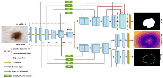 There are several networks that have been proposed in terms of enlarging the receptive field. Zhao et al. [] proposed the pyramid pooling module in the Pyramid Scene Parsing network to obtain the global contextual prior along with the sub-region context and then concatenate different levels of features as the final global feature. In DeepLab [], atrous convolution pyramid pooling analyzed the convolutional layers with filter at multiple sampling rates and effective fields-of-view, encoding the target object and the context of the image at multiple scales. In later years, the authors of [] upgraded their paper to DeepLabv3+ [], integrating the depthwise separable convolution into the atrous spatial pyramid pooling for faster and stronger network and reconsidering the decoder module for better object boundary recovery. The Dynamic Filter network [] produced filters based on the input, and output the generated parameters to the next input, learning both spatial and photometric changes. To model the geometric transformation, Deformable Convolutional network [] included deformable convolution which enables free-form deformation of the 2D sampling grid by the knowledge of preceding feature maps, and deformable ROI pooling, which enables the adaptation of object localization to different shapes. Different from the above methods, to obtain denser information from multiple kernel sizes, we capitalize on the SK Network from []. The light weight of the module and its great capacity to enlarge the receptive field support the adaptation of the main model to different sizes of lesion. Moreover, we built the model with the multitasking approach, which uses the label information of the distance map and the contour of skin lesion. Utilizing auxiliary tasks helps to guide the process of feature extraction and make the model aware of the boundary constraint and the shape of the unsettled appearance of the lesion.