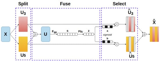 This module is constructed with the ideas of an automatic selection operation and a lightweight design. The architecture is illustrated in Figure 3 and could be briefly described with three steps, in the following order: Split, Fuse and Select. At first, a group of two or three depthwise convolutional blocks (with Batch Normalization [] and ReLU Activation []) with different dilation sizes are applied to the prior feature map X . This can extend to multiple branches with bigger kernel sizes to cover a larger receptive field. In our case, the combination of kernel 3 × 3 and kernel 5 × 5 achieves the best result. Subsequently, in the Fuse process, an element-wise sum function assembles information from U3 and U5 (U = U3 + U5). To embed global spatial information into the channel, a global average pooling function Fgp is placed, which generates channel-wise statistics for s, followed by is a fully- onnected layer Ffc which performs the guidance for the precise and adaptive selections. The feature map z contains the encoded attention weights for features in different scales. At the Select stage, the channel selection weights are computed by a classification layer based on their correspondence with the split feature maps in the beginning. We choose sigmoid as the classification function on an exchange with the softmax function in the original paper, since the task is binary classification in our method. The softmax function will be in charge when more than two data branches are generated in the Split stage. The learned parameters are applied to each feature map that is derived from the beginning, and all of them are then aggregated to be a new feature map. The new feature map is