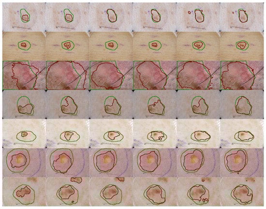 Skin lesions could be recognized as patches with darkened pigment or redness compared to the overall skin appearance. In most cases, they are harmless, but they may be indications of melanoma, which is a type of skin cancer. Although melanoma is among the most common cancers, the survival rate is high, at 92% [], as long as it does not reach the late stage of cancer. The severity of melanoma is proportional to the detection time from the emergence of skin lesion or its metastasis to other organs, such as the lung or brain. Therefore, early-stage diagnosis of melanoma is critical for success in cancer treatment. The conventional method of removing the malignant lesions from the skin is surgical excision. Before the main treatment, skin lesion’s condition is recorded as dermoscopic images, which visualize the impaired skin area in high resolution and detail. Subsequently, this image is scrutinized in order to locate the accurate area of lesion and diagnose whether it is dangerous. The preparation step was carried out manually in the past by experienced dermatologists, but this was time-consuming and the clinical inspections from individuals were subjective and inconsistent. There are requirements for an automatic inspection system that has the knowledge and follows the standard rules of skin evaluation, and could deal with an increasing number of dermoscopic images. Recently, computer-aided diagnosis (CAD) systems have been built up as human assistance and shown a promising ability in both skin lesion segmentation and classification.