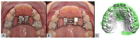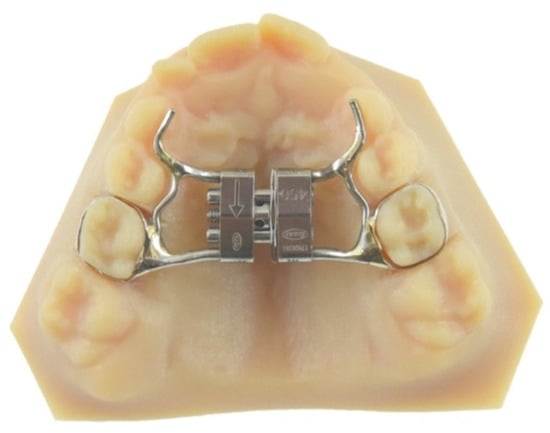 Transverse maxillary hypoplasia is one of the most frequent problems in interceptive orthodontics and one of the most studied topics in orthodontics. This condition is frequently related to as unilateral or bilateral cross-bite and/or antero-superior crowding. Posterior cross-bite is a common malocclusion in children with deciduous or mixed dentition with a prevalence between 8% and 22% [1]. Frequently, transverse deficit is also associated with a lateral shift of the mandible and/or a space deficit involving superior permanent canines, raising the risk of impacted canines. Even if cross-bite occurs in 6–30% of the general population, spontaneous resolution is very low (0–9%) despite the elimination of oral habits and other etiological factors [2,3,4,5]. Maxillary expansion is considered the gold standard to treat this type of malocclusion. It can be achieved using different types of appliances depending on the clinical defects that have to be treated [6,7,8]. The possibility to achieve palatal expansion decreases with age, so this treatment is to be executed as soon as possible, or until the median palatal suture remains fibrous. The suture starts to obliterate at around 14–16 years old, and past 13–14 years in women and 15–16 years in men it is difficult to achieve orthopaedic expansion. If maxillary expansion is executed with proper timing, it results in a fast, predictable and minimally invasive treatment. There are several orthodontic appliances leading to a maxillary expansion, which differentiate themselves for three main reasons: (a) patient’s age (with deciduous, mixed, or permanent dentition); (b) type of applied force (light/orthodontic or heavy/orthopaedic); and (c) time of force applications (continuous/discontinuous). The main difference concerns the type of resulting expansion: Rapid Maxillary Expansion (RME) or Slow Maxillary Expansion (SME) [9,10,11].