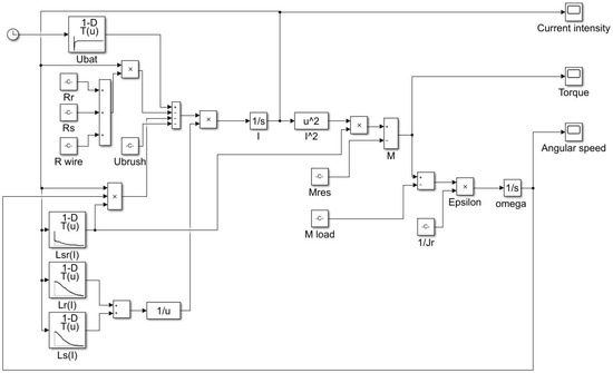 In the equations, is the terminal voltage of the battery during the test, is the brush voltage, and are the electric resistances of the rotor and stator windings, while the resultant electric resistance of the wires, connecting the battery to the motor, is denoted by . Characteristics and are the self-dynamic inductances of the stator and rotor windings, and is their mutual-dynamic inductance [11,16]. The characteristics above depend on the intensity of current flowing through the windings. The friction (bearing plus brush friction) and loading torques on the rotor of the motor are denoted by and respectively, and denotes the rotor’s moment of inertia. The value of sometimes can be found in the catalogue of the motor, while characteristics , , , and have to be measured. In this research, both and were measured. The block diagram of our simulation program is presented in Figure 2. The program is based on differential Equations (1) and (2).