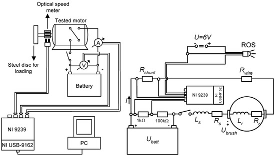 The speed of the rotor is measured by a remote optical led sensor (Model: ROS-P, Monarch Instrument) which has 6 or 0 V output voltage sign, depending on if there is a reflected light from the target into the ROS or not. The intensity of electric current flowing through the motor’s windings is measured as a voltage drop on a shunt resistor with an electric resistance of 0.0006 Ω (accuracy class 0.5). The terminal voltage of the battery—since it is bigger than the maximum allowed input voltage of the NI 9239 module—is measured applying a voltage divider with a ratio of 1:11. All the obtained voltage signs are fed into an NI 9239 voltage input module, which is connected to a PC through a Compact DAQ Chassis.
