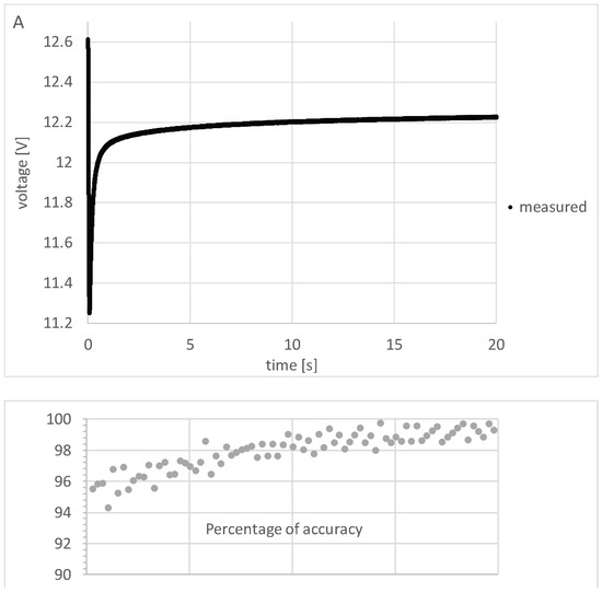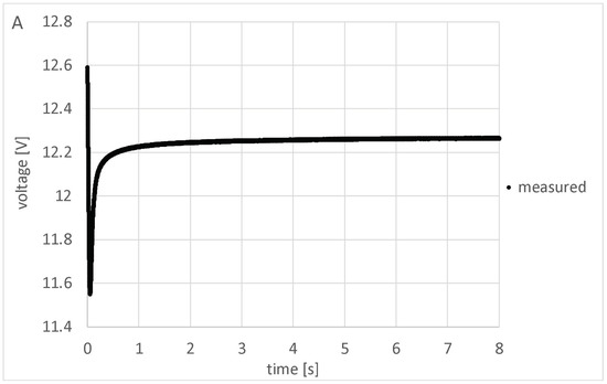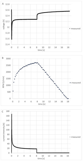 Results of a dynamic test measurement performed on the analysed SWDCM. (). (A) Battery terminal voltage, (B) motor speed, and (C) current intensity.