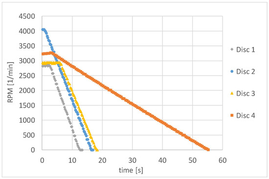 During the dynamic test measurements, the rotor spins up from rest to a given RPM, while the intensity of electric current flowing through the motor’s windings and the angular speed of the rotor are measured. After that, the voltage is switched off, thus the rotor runs out until it stops; meanwhile, its angular speed is measured. The dynamic test measurements were performed applying different mechanical loads on the rotor in the form of stainless-steel discs with precisely known moments of inertia. Figure 4 shows the results of a dynamic test measurement that was performed on the analysed SWDCM. The applied mechanical load () on the rotor was 0.0001576 kg·m2.