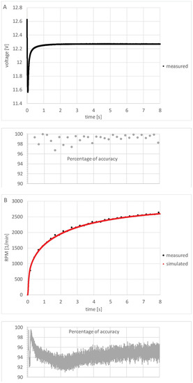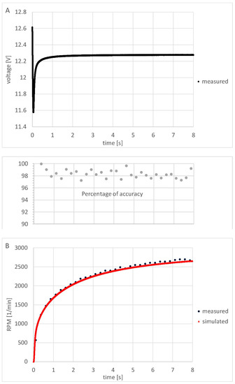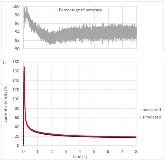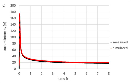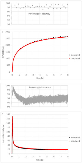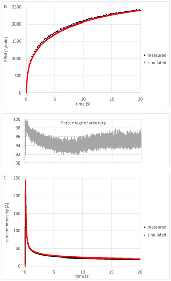 Results of dynamic test measurement and simulation performed on the analysed SWDCM. (). (A) Battery terminal voltage, (B) motor speed, and (C) current intensity.