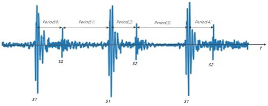 The number of samples in the audio file was equalized to adjust the length of the heart signal. Sampling range was determined using the cardiac sound peaks. The peaks of S1 and S2 can be found using the time interval features of S1 and S2. Figure 3 shows S1 and S2 detection through time difference. The time difference between S1 and S2 ranges from 250 to 350 ms, and between S2 and the next S1 the time ranges from 350 to 800 ms. Therefore, after finding peaks larger than a certain amplitude, the intervals between the peaks were calculated. If the previous interval was between 250 and 350 ms and the current interval is between 350 and 800 ms, then S1 and S2 can be identified [].
