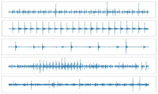 To achieve a constant length of data, we assumed that it took about 5 s to judge between normal and abnormal heart sounds. However, extracystoles, where the pulse beats normally and then skips once, can occur once or twice or dozens of times a minute. Atrial fibrillation, in which the heart beats irregularly, can also be temporary or persistent. Therefore, in the experimental data, the assumption that this irregular abnormal heartbeat occurs within 5 s was added.