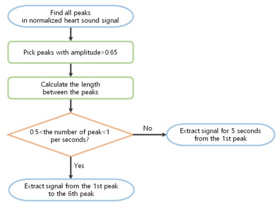 Ref. [] was able to find S1 and S2 easily in ideal heartbeats, but there are many exceptions for diseased heartbeats. For example, as shown in Figure 4, S1 and S2 were not found when the size of a particular heartbeats were large or small, when the intervals between the extracted peaks were irregular, when the intervals of the heart signals were not constant, or if the heart signals were not clear. In this paper, we propose a method of finding peaks and make them into constant length data. Normally, S1 is louder than S2 at the apex, and softer than S2 at the base of the heart. Empirically, the louder heart sound was close to 1, and the softer heart sound had about half the amplitude of the loud sound in the normalized signal. Thus, 0.65 was set as the threshold, and then peaks larger than the threshold were selected from the normalized signals. Since the cardiac cycle is 800 ms, a peak larger than 0.65 with at least 800 ms intervals was considered the main cycle S. The coordinates of the S were obtained through the Scipy python library. Among them, the first S and sixth S coordinates were truncated to produce data. However, if the heart beats irregularly or if the murmur is large, it is impossible to find S1 using this method and to cut it at regular intervals. Therefore, when the number of peaks is shorter or longer than the average cardiac rate of a healthy person (60–100 beats per minute), that is, when the number of peaks is less than 0.5 or more than 1 per second, 5 s data from the first peak were used. For example, if the sampling rate was 2000, the first S point t to t + 2000 × 5 was used to make data. The whole process can be seen in the flow chart in Figure 5.