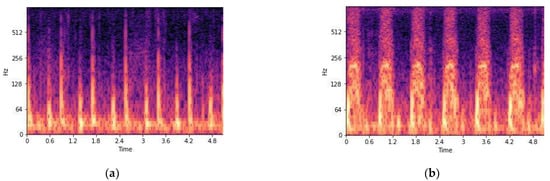Data in the time domain are converted into the frequency domain through Fourier transform for signal analysis. However, the Fourier transform (FT) does not represent the transition of the signal over time. In other words, when using FT, it is impossible to know at what point the frequency changes when the frequency changes over time. A Short Time Fourier Transform (STFT) was proposed to overcome this. STFT divides time by a specific window size and performs a Fourier transform. Window length may vary depending on the application. In the spectrogram, a long window size is used to increase the frequency resolution, and a short window size is used to increase the time resolution. When applying STFT to the heart sound, the appropriate window length is 98.91% of the heart sound data length []. A spectrogram represents the frequency content of the audio as colors in an image. The horizontal axis is time information. The vertical axis is the frequency and the lowest frequencies at the bottom and the highest frequencies at the top. The colors are the amplitude of a specific frequency at a specific time. In this paper, time-domain audio signals of about 5 s were transformed into frequency-domain spectrogram features as Figure 6. Figure 7 shows augmented abnormal data spectrograms in train dataset.