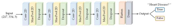 The network used in the experiment takes a 217 × 334 heart sound spectrogram as input. The convolution layer, pooling layer, and dropout layer were repeated four times and then two dense layers were added. This network performed a binary classification that distinguished two classes, nonsick and sick. Binary cross entropy loss and Adam optimizer were used during training. The structure of the network is shown in Figure 8.