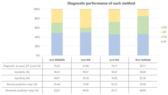 Diagnostic performance was compared through an ablation study to find out the effect of improving the performance of data generalization (DG) and data augmentation (DA). The experiment was conducted in the same environment except for DG and DA. The amount of data used for the test was 208, which did not belong to the training or validation dataset.
