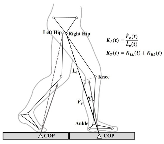 Definitions of the leg stiffness (KL) and total leg stiffness (KT). Fe(t) is effective GRF, Le(t) is effective leg length and φ(t) is the angle between the longitudinal axis of the shank and the line joining the COP to the center of the hip joint. KT is defined as the sum of KL of the left leg (KLL) and KL of the right leg (KRL) (Adapted from [14]).
