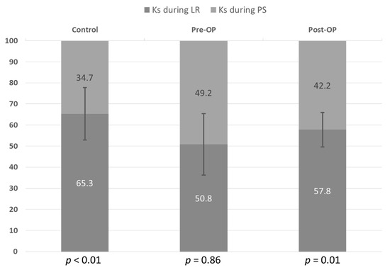 No significant differences in time-averaged values of KL and KT over LR and PS were found between CP and Control (Table 2). In the healthy Controls, the limb shared greater KT during LR than during PS (Figure 3 and Figure 4a,b). Compared to Control, the CP group showed significantly decreased KS during LR but increased KS during PS before surgery (Pre-OP) (Table 2), resulting in similar KS between LR and PS within the CP group (Figure 3 and Figure 4a,b, Table 2). After surgery, the CP group showed significantly greater KS during LR than during PS (Figure 3 and Figure 4a,b, Table 2).