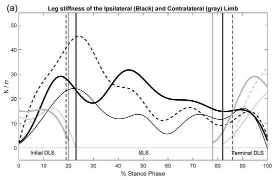 (a) Leg stiffness of the ipsilateral (black) and contralateral limb (gray), and (b) total leg stiffness during stance phase of gait for the Control group (dashed) and CP group before TRS (thick) and after TRS (thin). The vertical lines around 20% stance phase indicate the contralateral toe-off or the end of the initial double-limb support (DLS), while those around 80% stance phase indicate the contralateral heel-strike or the end of single-limb support (SLS) or the beginning of terminal DLS.