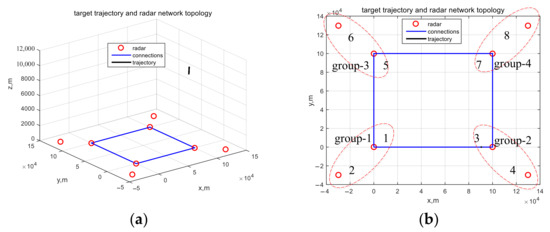 In the scenario, the target is tracked by an eight-radar network divided into four groups, as shown in Figure 1. The adjacency matrix of the groups is expressed as