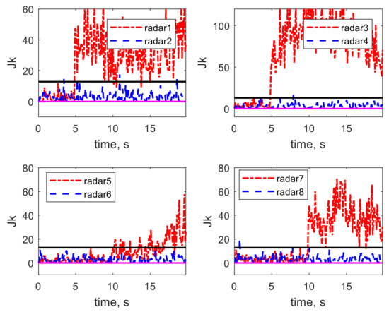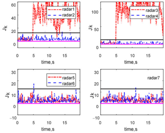In this part scene with four radars under attack was considered to test the estimation accuracy when half the radars in the network were under attack. Radar 1 and radar 3 were attacked starting from simulation time , and radar 5 and radar 7 were attacked starting from simulation time . Figure 6 shows the injected data detection results for all the radars. It can be seen that the attacks could be detected in a timely manner.