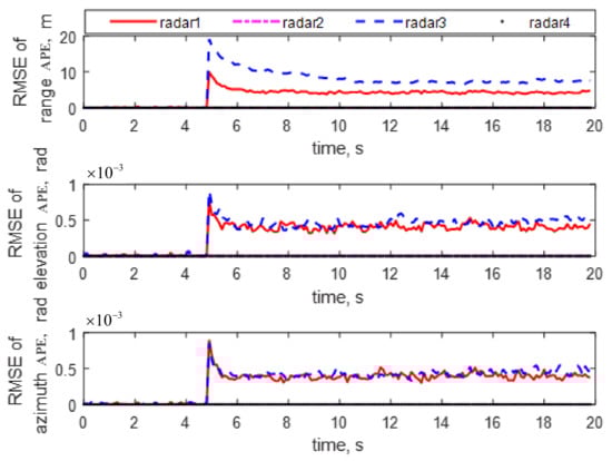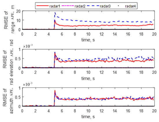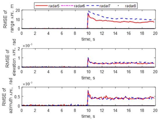 Figure 7 and Figure 8 show the RMSE of the estimated range, elevation and azimuth APE for radars 1–4 and radars 5–8 over time, respectively. It can be seen that the attack parameters could be estimated as soon as the attacks occurred.