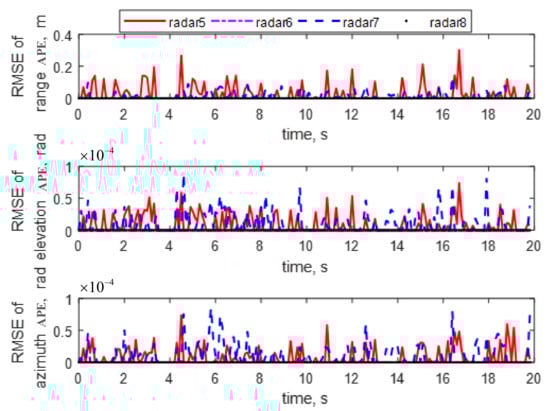 In order to verify the superiority of the proposed attack parameter estimation method in DSE-FDI, the RMSEs of the attack parameter estimations (APE) were obtained by 100 Monte Carlo runs. Figure 3 and Figure 4 plot the RMSE of the estimated range, elevation and azimuth APE for radars 1–4 and radars 5–8 over time, respectively. It can be seen that the APE of all the radars were close to zero during time . The reason for this was that there were no attacks in this time interval. When the simulation time , the attack parameters of radar 1 and radar 3 were estimated, and the RMSEs of the APE converged fast. Note that the RMSEs of APE of other radars were not zero when no attack existed, which was due to the false alarms in the 100 Monte Carlo runs.